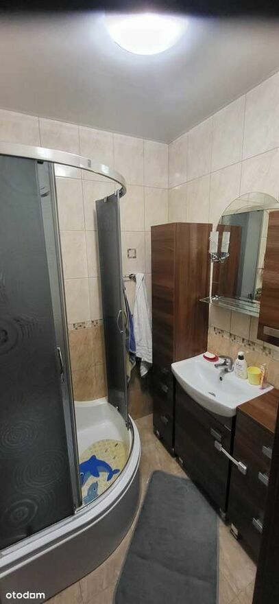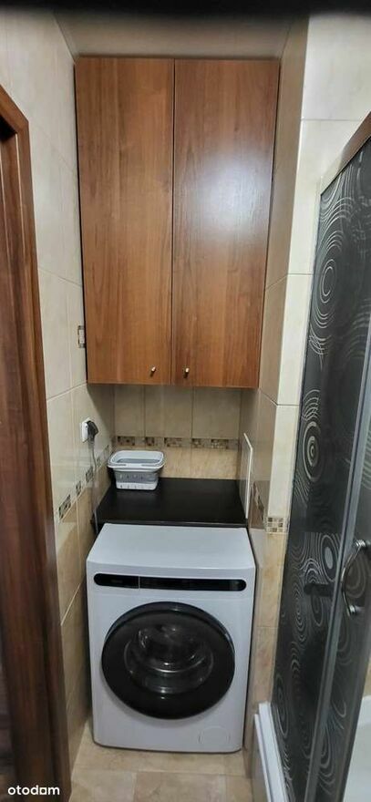W sypialni znajduje się duzo łóżko, pojemna szafa, toaletka z lustrem. Łazienka jest wyłożona kafelkami i wyposażona w prysznic, pralkę oraz meblościankę łazienkową. Toaleta jest odseparowana od łazienki i posiada umywalkę.