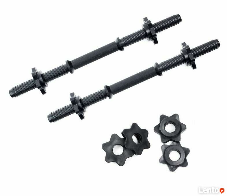 Zestaw hantli 2x20 kg- Dwa krótkie gryfy z zaciskami- Obciążenia bitumiczne o wadze 38 kg